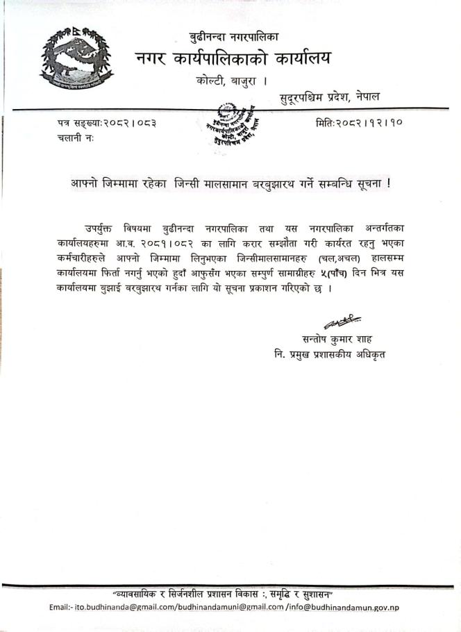 Home » आफ्नो जिम्मामा रहेका जिन्सी सामान बझबुझारथ गर्ने सम्बन्धी सूचना !