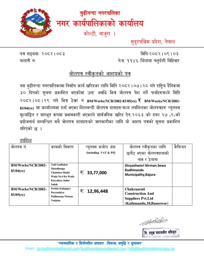 Home » बोलपत्र स्विकृतिको आशयको पत्र ।