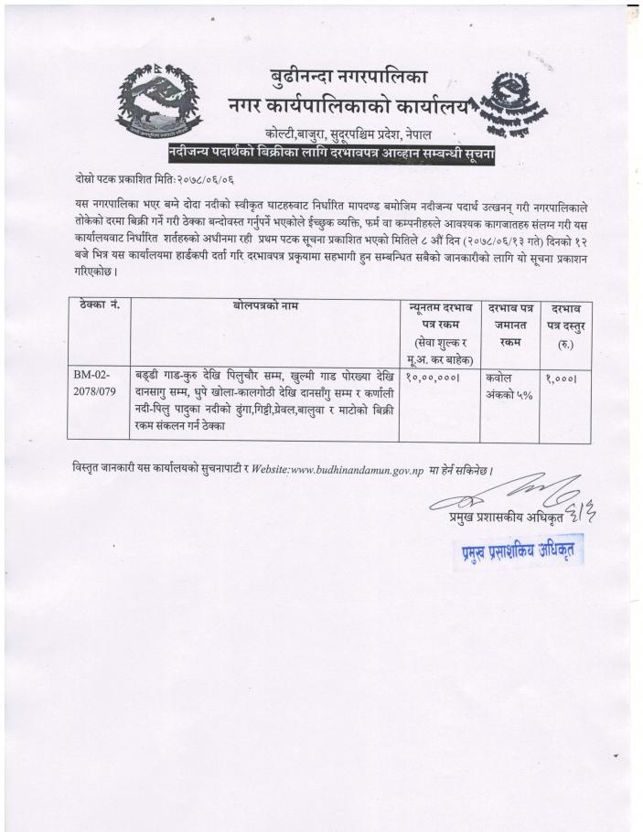 नदीजन्य पदार्थको विक्रिका लागि दरभावपत्र आव्हान सम्बन्धी सूचना सूचना सूचना ।